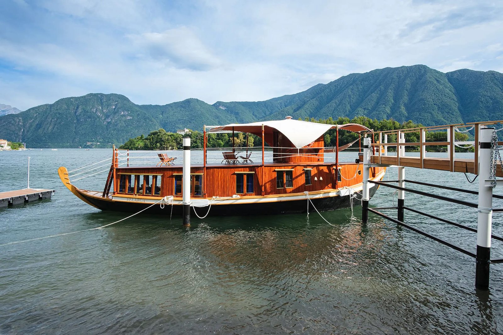 La Velarca fu progettata e costruita tra il 1959 e il 1961 dallo studio BBPR, incaricato dai coniugi Emilio e Fiammetta Norsa di realizzare un’abitazione galleggiante; il risultato è una vera e propria opera di architettura e un oggetto di design, che riprende nelle forme e negli spazi le caratteristiche dell’architettura tipica dello studio milanese: l’attenzione all’ambiente, all’interpretazione del luogo, alla qualità della progettazione e all’accuratezza della costruzione, che rendono la Velarca straordinariamente moderna e allo stesso tempo ancorata al passato. Ed è infatti proprio nel passato e nella storia del lago di Como che si poggia la Velarca: per progettarla è stato aggiunto un volume abitativo sullo scafo di un’antica gondola lariana di 19 metri, la “Corriera Tremezzina”, che dal 1911 attraversava il lago di Como trasportando merci e persone.